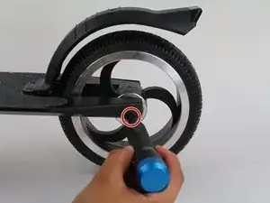 Переверните самокат и удалите винт того же размера с противоположной стороны колеса.