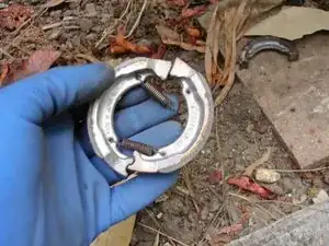 Соедините две тормозные колодки и пружины. Сначала проденьте обе пружины через одну колодку, затем свободно закрепите другой конец пружин на второй колодке.